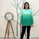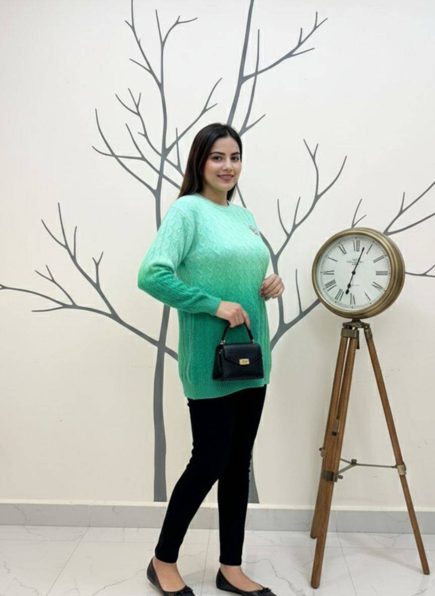 This elegant and cozy ensemble features a long-sleeved, crew-neck sweater in a beautiful ombre gradient that transitions smoothly from a light mint or seafoam green at the top to a rich, deep emerald green at the hem. The sweater showcases a textured cable-knit pattern throughout, adding classic style and depth.