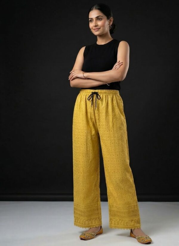 Elevate your fusion wardrobe with these vibrant palazzo pants. Featuring authentic Lucknowi Chikankari hand-embroidery, these trousers blend heritage craftsmanship with a contemporary wide-leg silhouette. Perfect for haldi ceremonies, festive gatherings, or a chic summer day out.