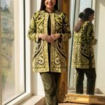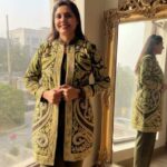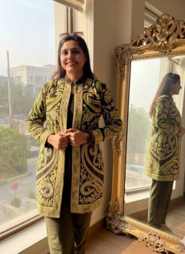 The overall aesthetic is traditional ethnic wear elevated with a modern fabric and contemporary embroidery pattern, making it look opulent and festive.