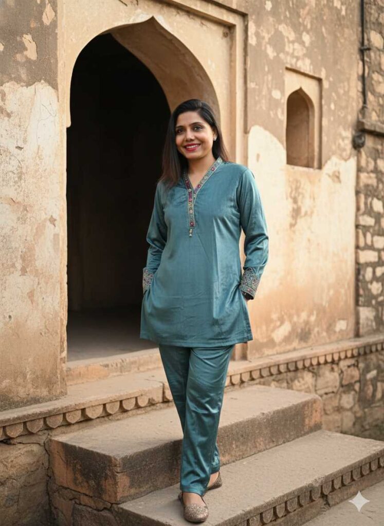 Heritage Embroidered Cotrise Velvet Co-ord Set is a soft material (Cotrise Velvet) that provides excellent warmth and a structured, non-clingy fit. A masterpiece of style and comfort, this long embroidered co-ord set is your luxurious solution for cold-weather elegance. Its rich texture and vibrant embroidery ensure you stand out while staying cozy. The long length offers full coverage and can be worn comfortably over layers or paired simply with leggings or slim pants.