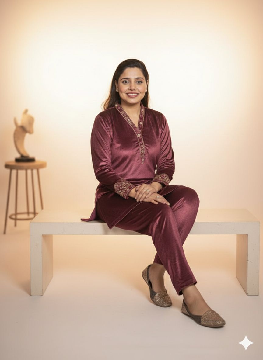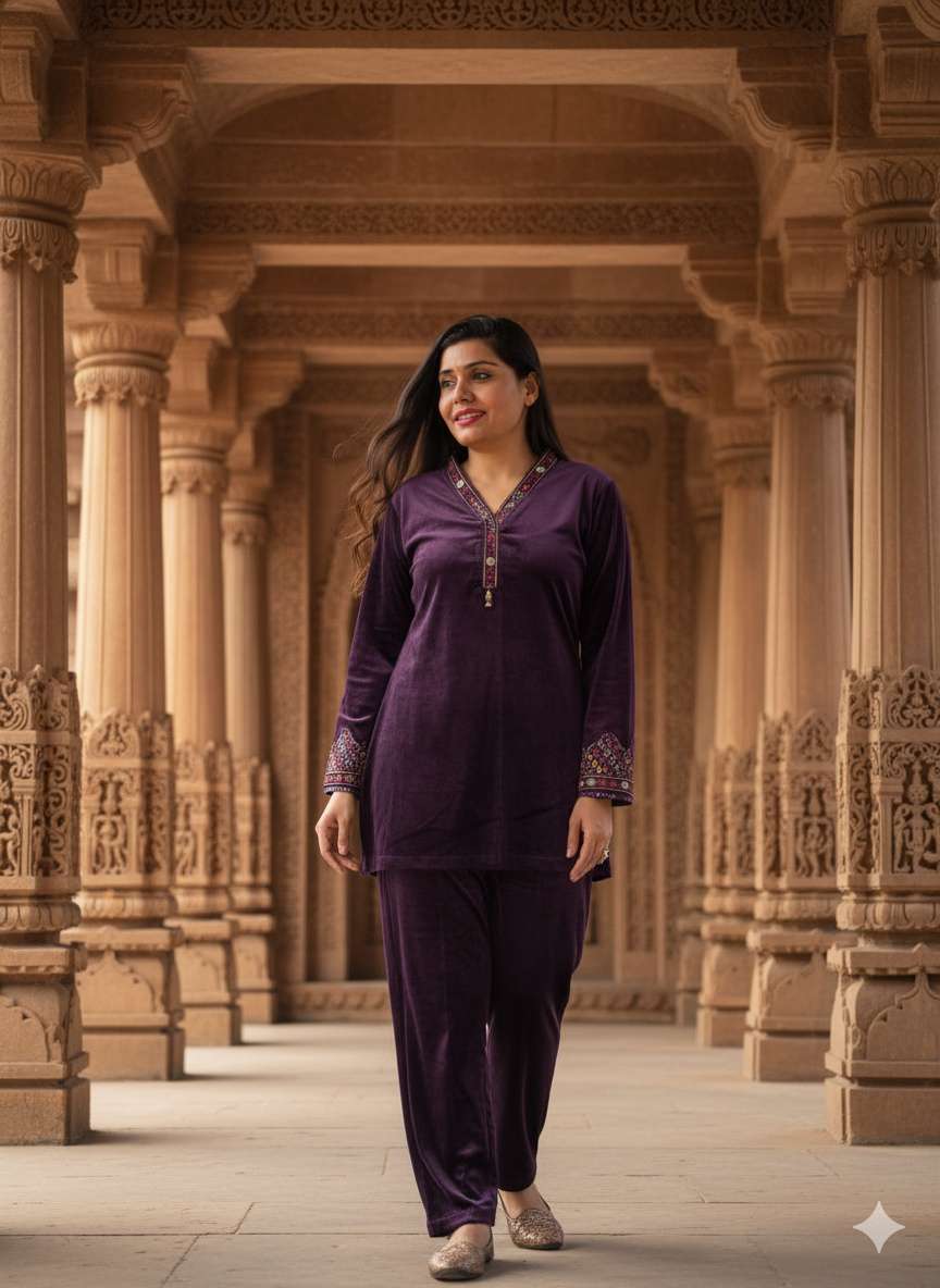 Heritage Embroidered Cotrise Velvet Co-ord Set is a soft material (Cotrise Velvet) that provides excellent warmth and a structured, non-clingy fit. A masterpiece of style and comfort, this long embroidered co-ord set is your luxurious solution for cold-weather elegance. Its rich texture and vibrant embroidery ensure you stand out while staying cozy. The long length offers full coverage and can be worn comfortably over layers or paired simply with leggings or slim pants.