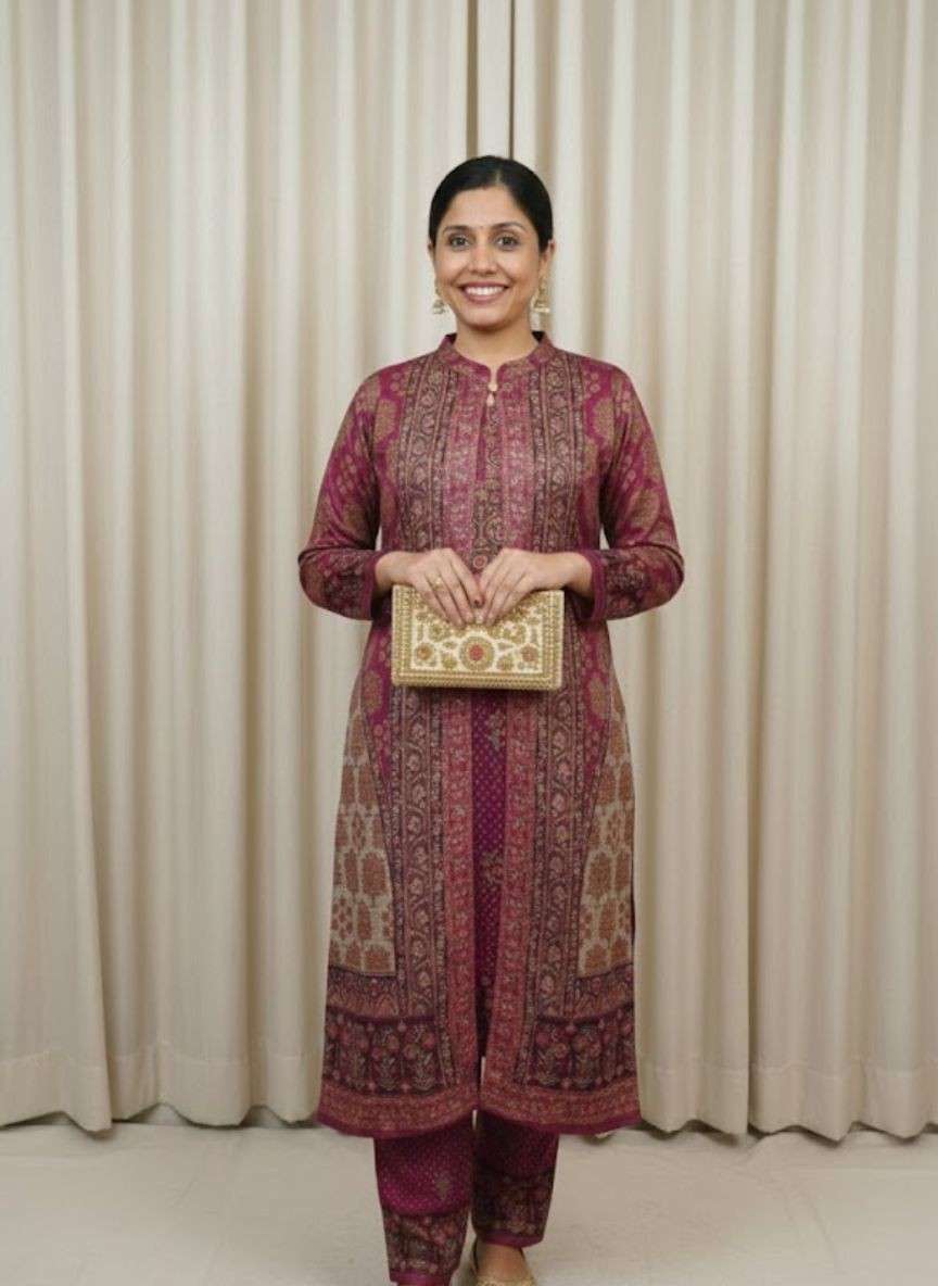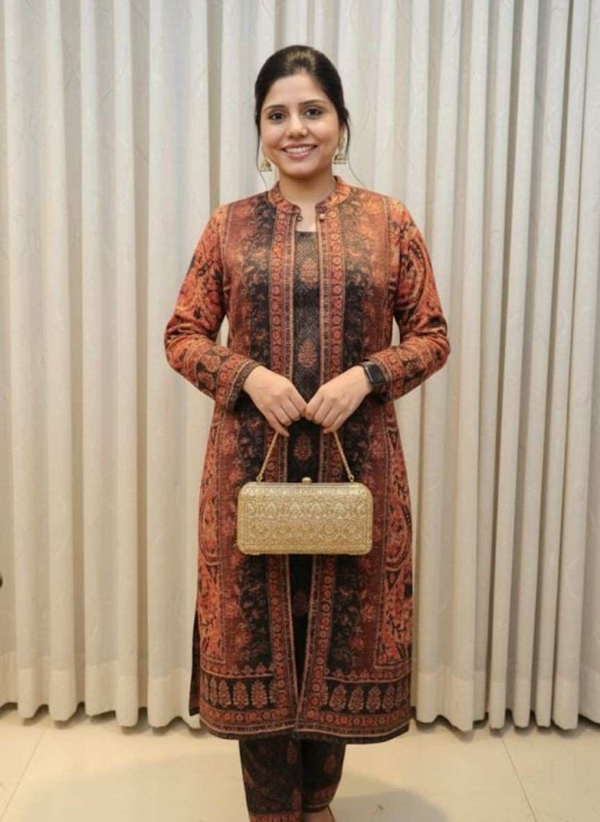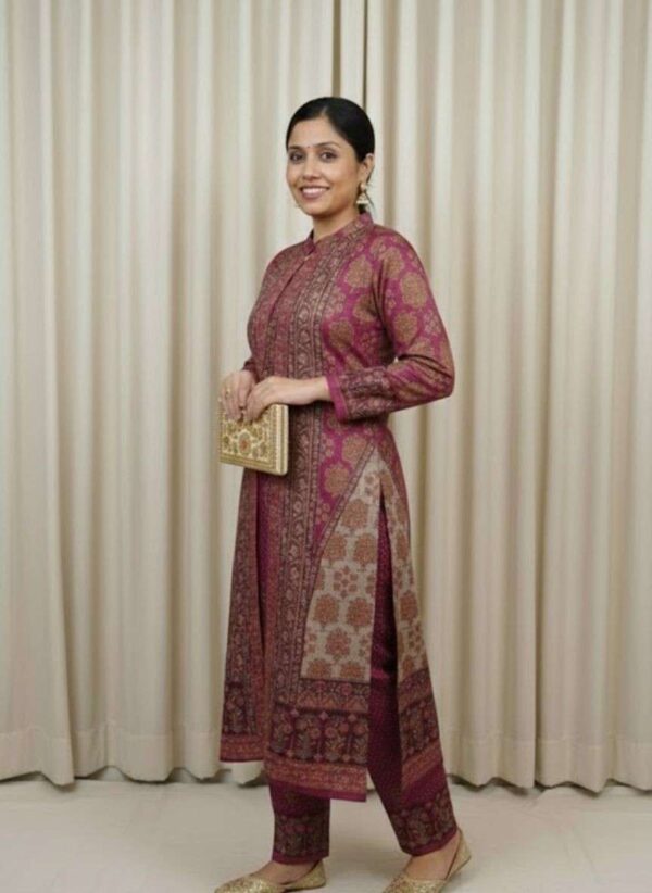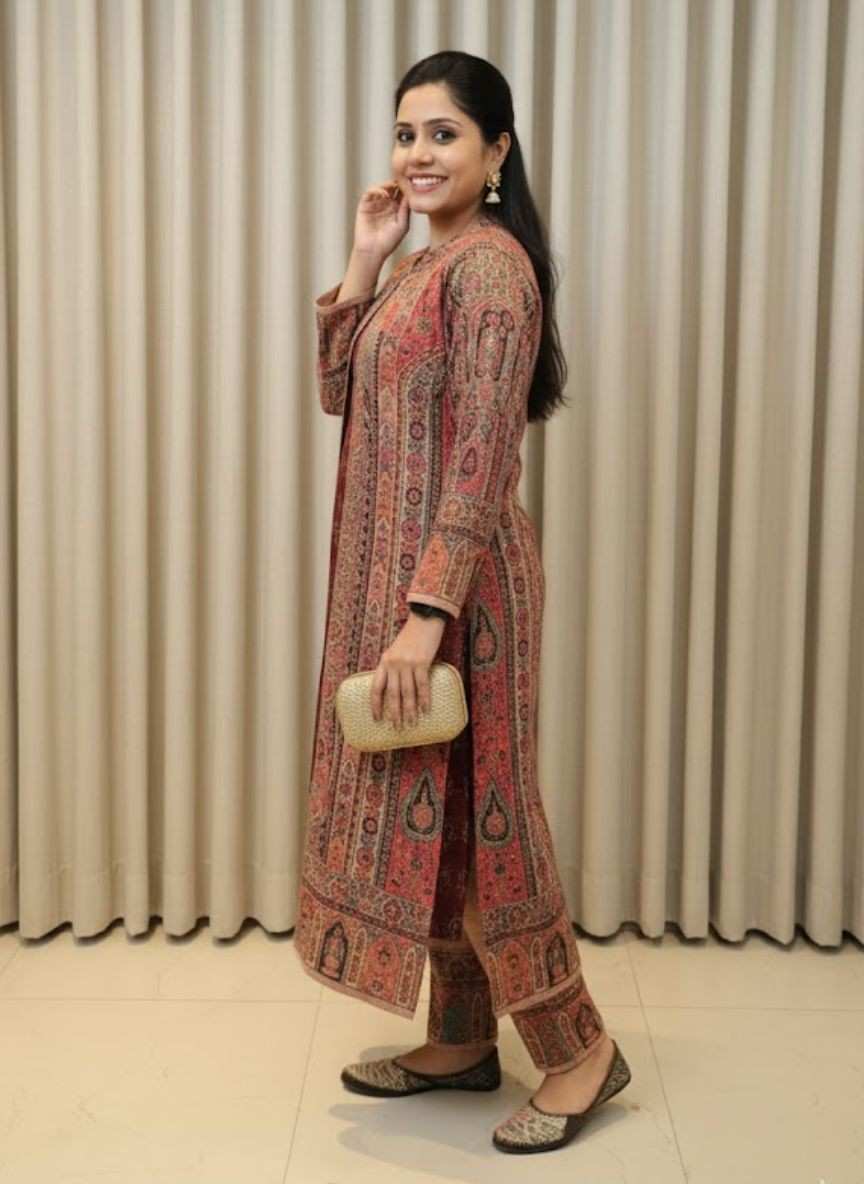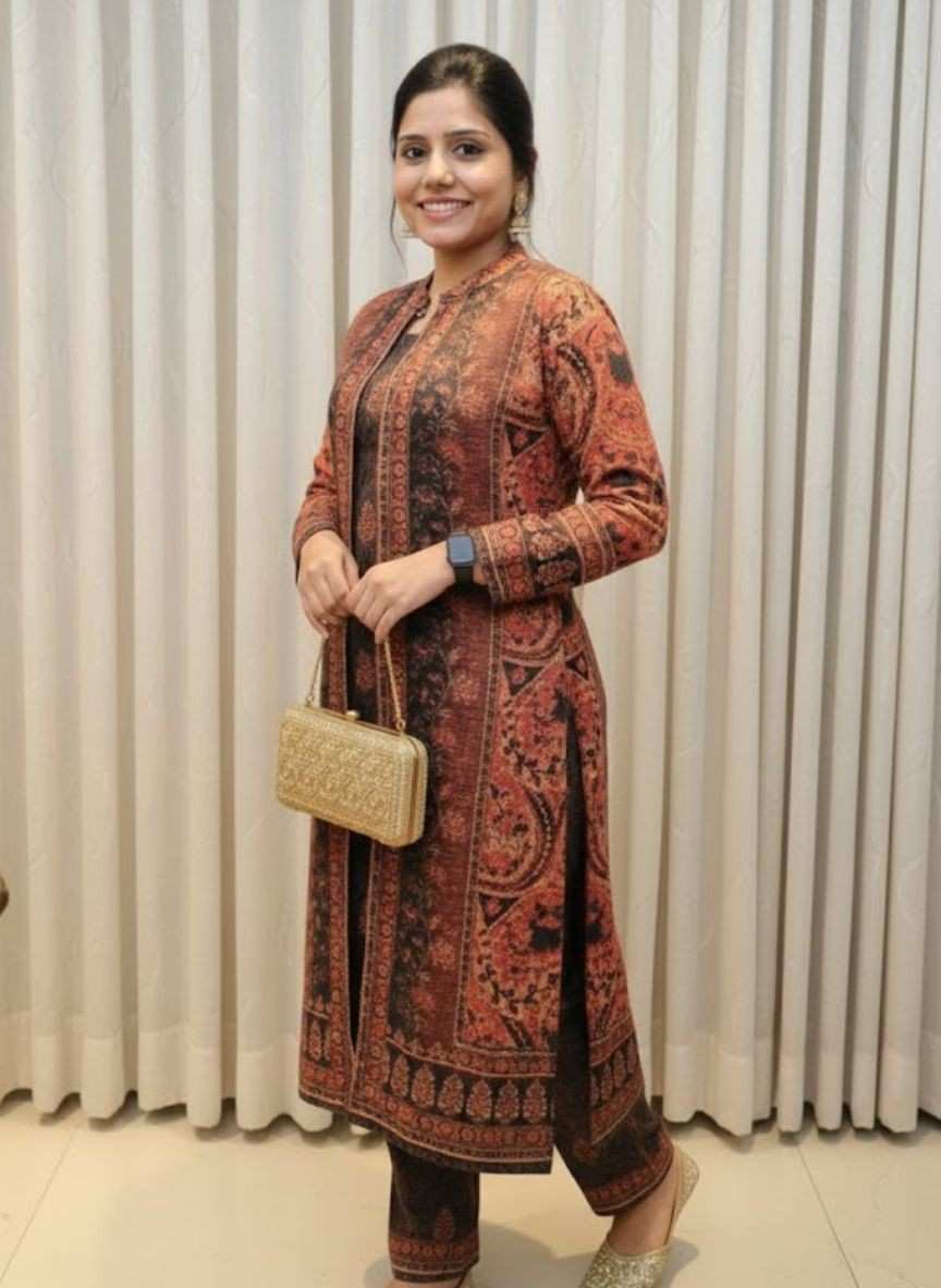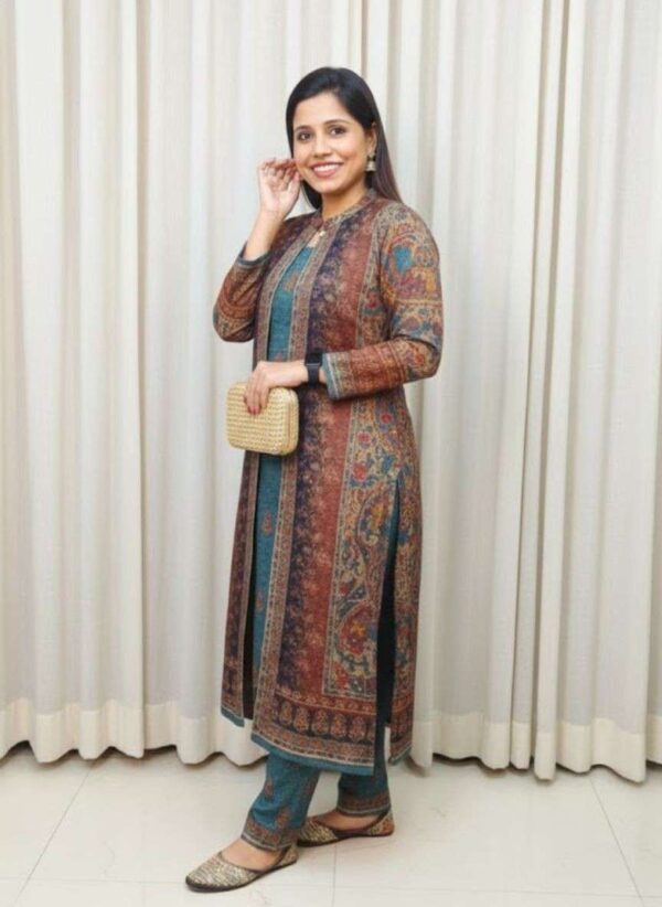 Print: Features an intricate, all-over ethnic or Kashmiri-inspired paisley and ornamental print. The dense pattern is used throughout the set, giving it a coordinated and luxurious look.