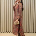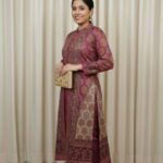 This sophisticated three-piece suit set perfectly blends traditional aesthetics with modern styling, making it an ideal choice for festive occasions, semi-formal gatherings, or evening events. Features a mandarin or band collar and full-length sleeves. The print is bold and runs vertically, visually elongating the silhouette.