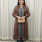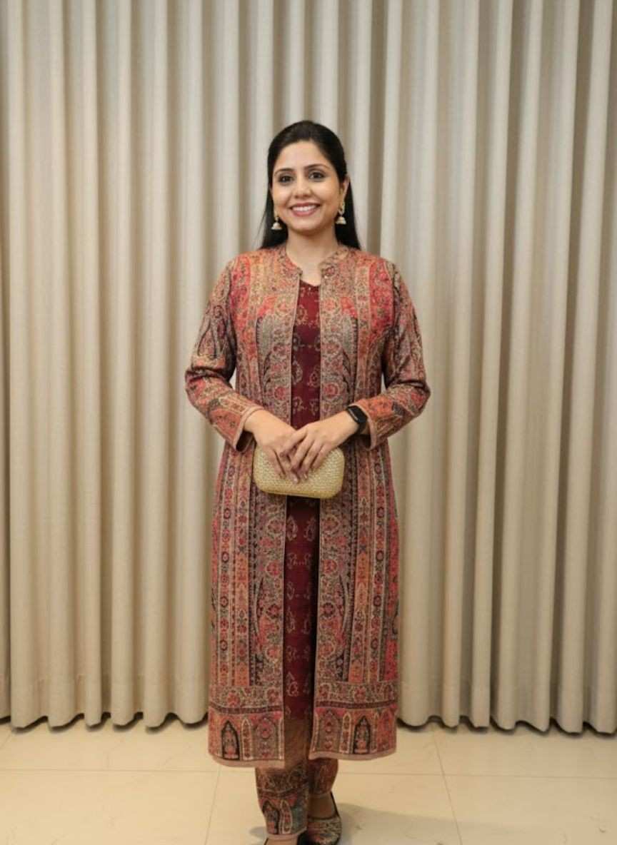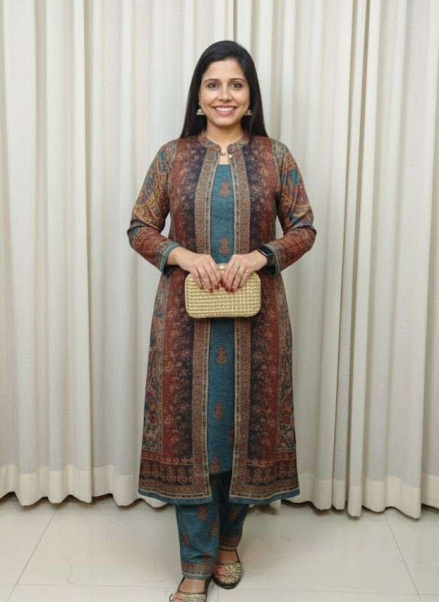 Style: Three-Piece Long Shrug Suit Set (Kurta/Inner, Trousers, and Long Open Jacket/Shrug).