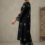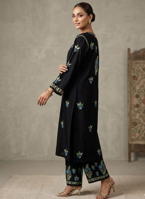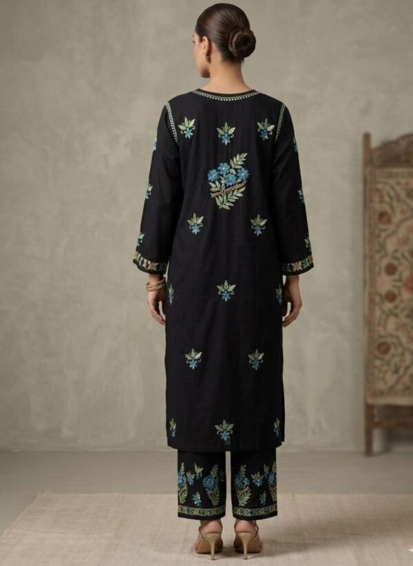 Wash Care: Hand wash separately in cold water or dry clean to maintain the vibrancy of the embroidery and the depth of the black fabric.