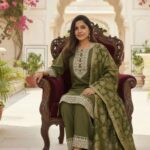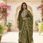 Embrace timeless elegance with this luxurious olive green suit set, perfect for festive occasions, weddings, or formal gatherings. The ensemble features a beautifully tailored kurta and matching straight-cut trousers, crafted from a rich, comfortable silk blend.