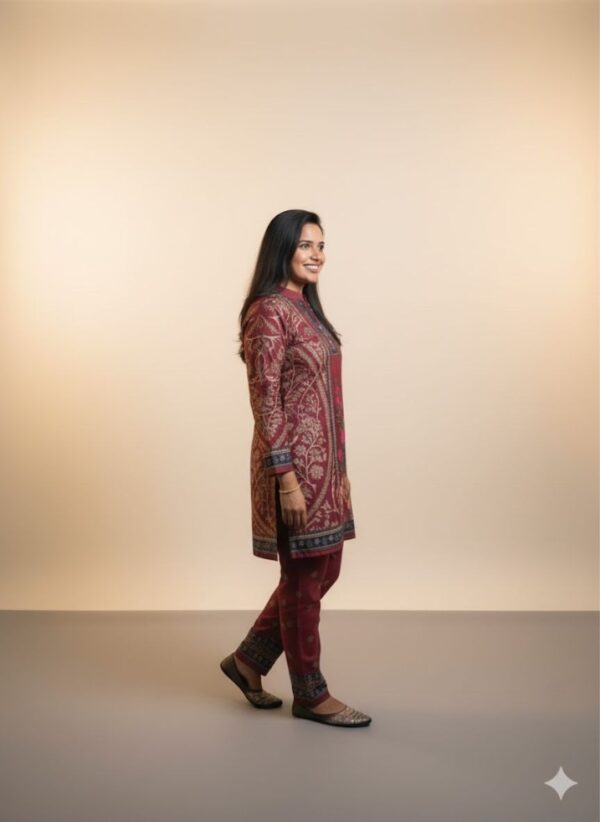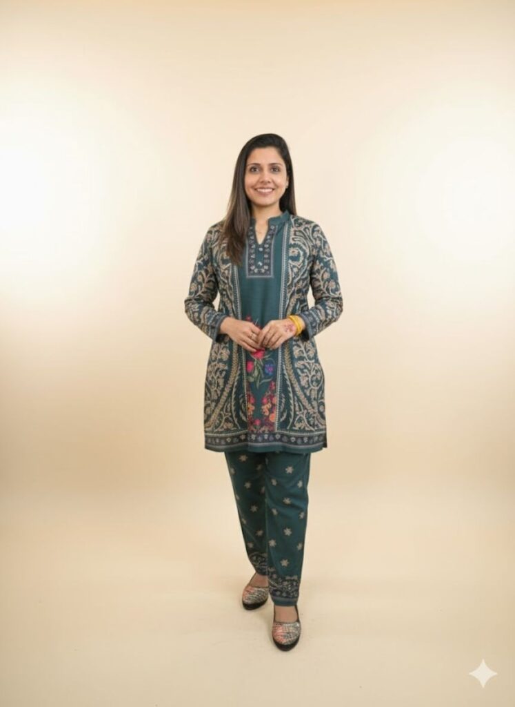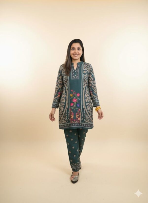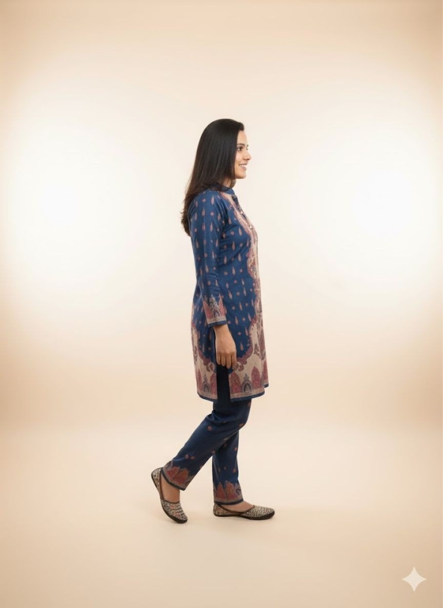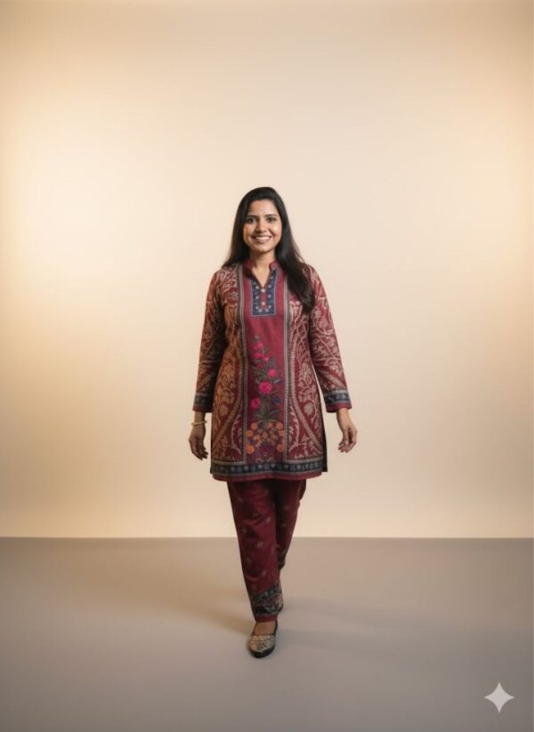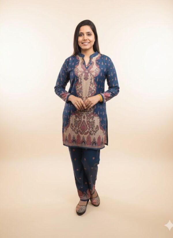 Soft Woollen Digital Print Co-ord Set is a two-piece coordinated outfit made from wool or wool-blend fabric, featuring a matching top and bottom for a complete, stylish and warn ensemble perfect for colder weather. These sets can be styled for various occasions, from casual lounge wear and errands to office wear or even dressed-up looks with the right accessories. Woollen coord sets are considered timeless, and as a complete set, it’s an easy solution for winter styling, making it simple to get dressed and go. The beauty of Co-ords lies in their simplicity and versatility, making them a must have in every fashion.