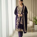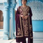 Step out in sheer elegance and warmth with our stunning Velvet Suit Set, a perfect ensemble for festive occasions, winter weddings, and sophisticated evening wear. Crafted from luxurious, deep purple velvet, this three-piece set showcases the intricate artistry of traditional Indian embroidery.