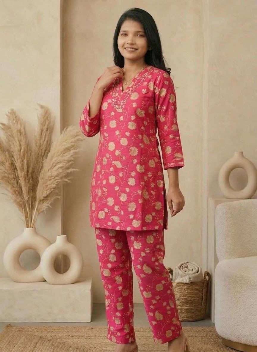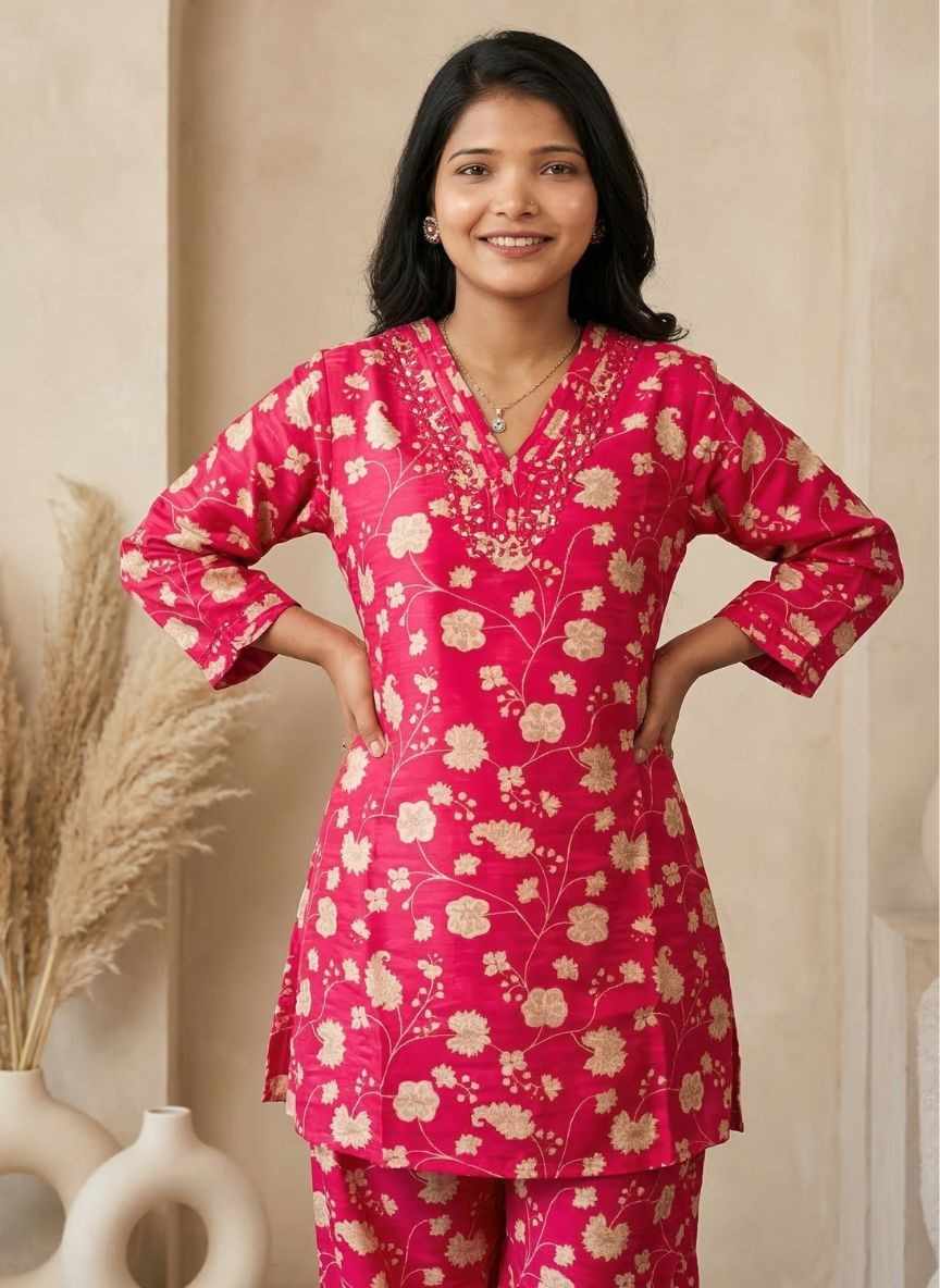 Elevate your ethnic wardrobe with this vibrant Fuchsia Pink Floral Co-ord Set. This contemporary take on the classic kurta-pyjama features a rich, silk-blend fabric adorned with intricate gold-toned floral motifs, making it a perfect choice for festive gatherings, pre-wedding celebrations, or elegant evening wear.